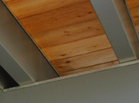 | Fugenbild bei der Verlegung. Ist das Holz trocken, mag ein Quellen und Schwinden im Fugenbild weniger auffallend sein. Ist das Holz frisch, wird es später unterschiedliche Fugen geben können. | Fugenbild nach dem Austrocknen, je nach Einschnitt (Jahrringe mehr stehend oder liegend) ist das Schwinden quer zum Brett verschieden groß. In Längsrichtung ist es nicht so auffällig. |