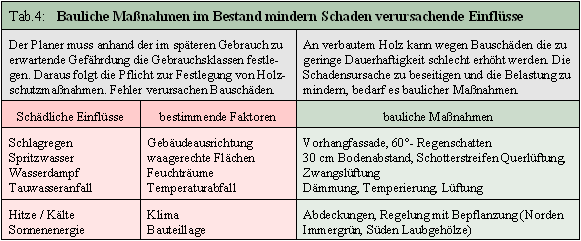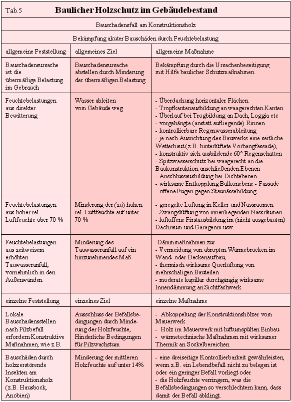 Bei der Bekämpfung akuter Bauschäden am Konstruktionsholz im Gebäudebestand, denen als Ursache eine übermäßige Belastung zugrunde liegt, führen konstruktive Schutzmaßnahmen zur Minderung der übermäßigen Belastung und gleichzeitig zum Abstellen der Bauschadensursache. Die dazu nötigen baulichen Maßnahmen an der vorhandenen Baukonstruktion (siehe Tab.5) sind oft sehr einfach. Wirtschaftliche und ökologische Vorteile