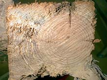 So wird z.B. Fichtenholz, wenn es für Insekten unzugänglich, d.h. beiderseits beplankt ist (siehe im Bild rechts) und ohne die Gefahr einer Durchfeuchtung eingebaut wird, im Rohzustand verbaut. Eine Gefahr für Insektenbefall ist bei dieser Konstruktion nicht mehr gegeben bzw. anzunehmen. Wo dies nicht möglich ist, oder wo man es im rauhen Baustellenbetrieb nicht sicher gewährleisten kann, dass nicht doch irgendwo "Schlupflöcher" bleiben oder entstehen, bietet sich als nächste einfache Alternative die Verwendung von Farbkernholz an. Der Aufwand an Materialkosten sind nur geringfügig teurer. Verglichen mit den früheren Kosten chemischer Behandlungen und Nachbehandlungen fällt dies nicht ins Gewicht. Warum sollte man auch darüber nachdenken, solange ein chemischer Schutz als eín "Muß" galt. Alle am Bau beteiligten sahen es als "gottgegeben" an und der Bauherr wurde gar nicht erst gefragt. Nach DIN 68800-1 ist unter den (Gebrauchs-)Bedingungen der Gebrauchsklasse GK 1, wo eine Gefahr durch Insektenbefall besteht, für die hauptsächlich verbaute Fichte keine Notwendigkeit einer Holzvergiftung gegeben, wenn z.B. Farbkernhölzer verwendet werden 2). Die folgenden Bilder demonstrieren warum: