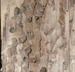 Spuren der Grabwespen - viele Kammern sind hier angelegt und waren zuvor mit Fliegenresten ausgefüllt, die der jeweiligen Larve als Lebendnahrung dienten. Es handelt sich um einen zuvor schon geschädigten alten Eichenbalken, der aufgespalten wurde. Holztechnisch sind die Schäden ohne Belang, da der vorangegangene Schaden schon größer war. Foto: Rüpke |