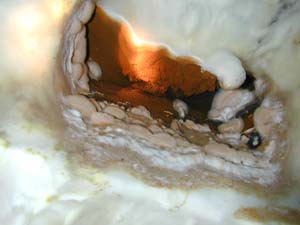 Echter Hausschwamm: Der reife Fruchtkörper fängt gerade an, seine fertig produzierten Sporen (später millionenfach) auszuwerfen. Der rotbräunliche Staub am schneeweißen Mycel macht dies erkennnbar. Später wird der Umgebungsbereich von Milionen Sporen rostbraun gepudert. Foto: Rüpke |