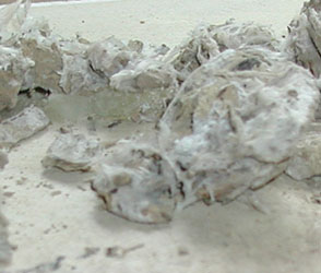 Schüttung aus porosiert gebranntem Ton (Blähton) ist entsprechend der Feuchteverteilung bis zum Grund vom Echten Hausschwamm durchwachsen. Der Befall endet an der trockenen Zone. Foto: Rüpke |