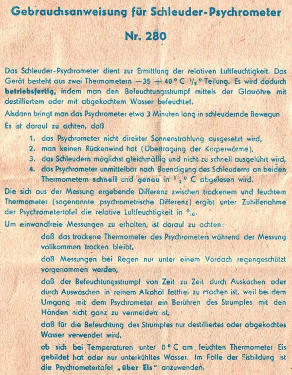 Eines befeuchtet, eines trocken, wird dieses Doppelthermometer per Hand in der Luft geschleudert, siehe Bild rechts. (Neuere Modelle haben dazu einen Federwerkantrieb.)