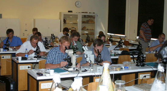 Wie ein Bildungsurlaub war der Mikroskopiekurs bei den Restauratorinnen mit dem Kollegen Arnold (als Fotograf leider nicht im Bild) im Nov. 2010 an der HAWK in Hildesheim. An den Mikroskopen arbeiten die Studentinnen gerade daran, holzzerstörende Pilze anhand ihrer Merkmale zu identifizieren. Zwar eng, aber technisch vom Feinsten.