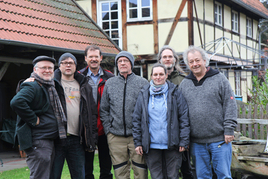 Herbst 2011 in der Remise in Hannover, einem Versuchsbau aus ausschließlich vorab vital pilz- und insektenbefallenem Bauholz (Ei/Fi). Hier ging es um ketzerisches zu Themen des konstruktiven Holzschutzes und zur neuen DIN. V.l. Uli Arnold, Raimund Maier, Robert Ott, Henry Rüpke, Lutz Parisek, nicht im Bild die Fotografin, Katrin Bartel.